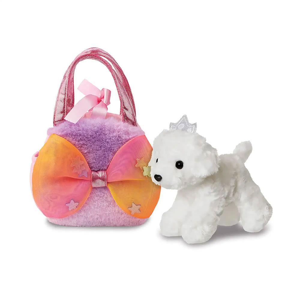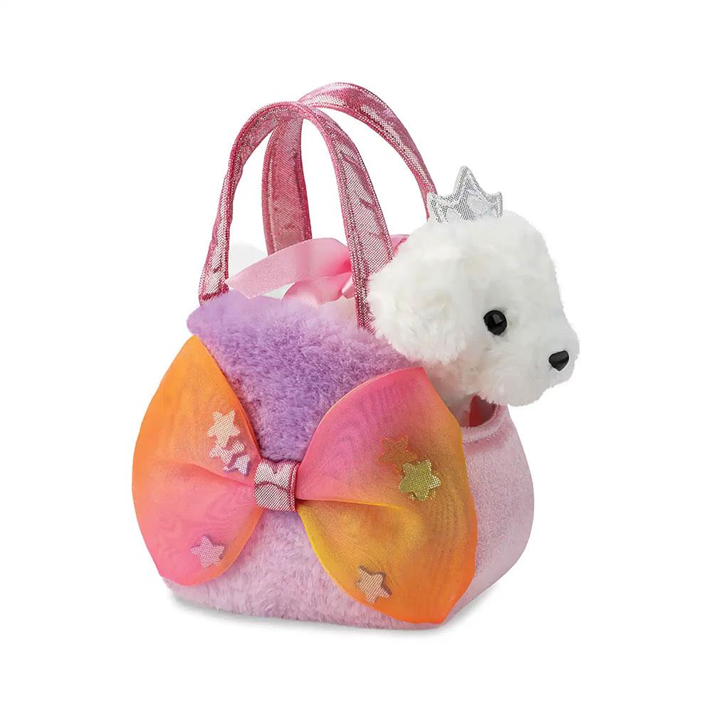 Fancy Pals Kurdeleli Prenses Yavru Köpek peluş oyuncağıyla tanışın! Gümüş bir taç takan bu sevimli yavru köpek, şirin taşıma çantasının içinde oturur. Köpekleri seven herkes için mükemmel bir hediyedir! En güzel yanı, köpeğin çantaya bağlı olmaması, böylece iki hediye bir arada sunulur – bir el çantası ve bir peluş oyuncak!