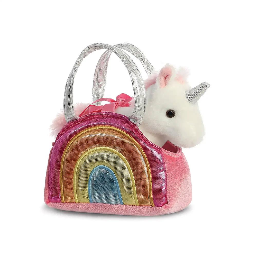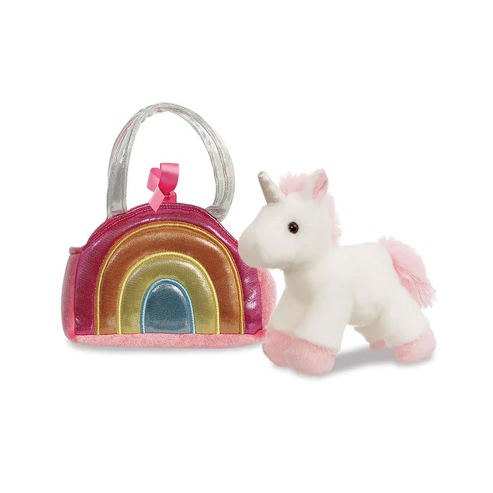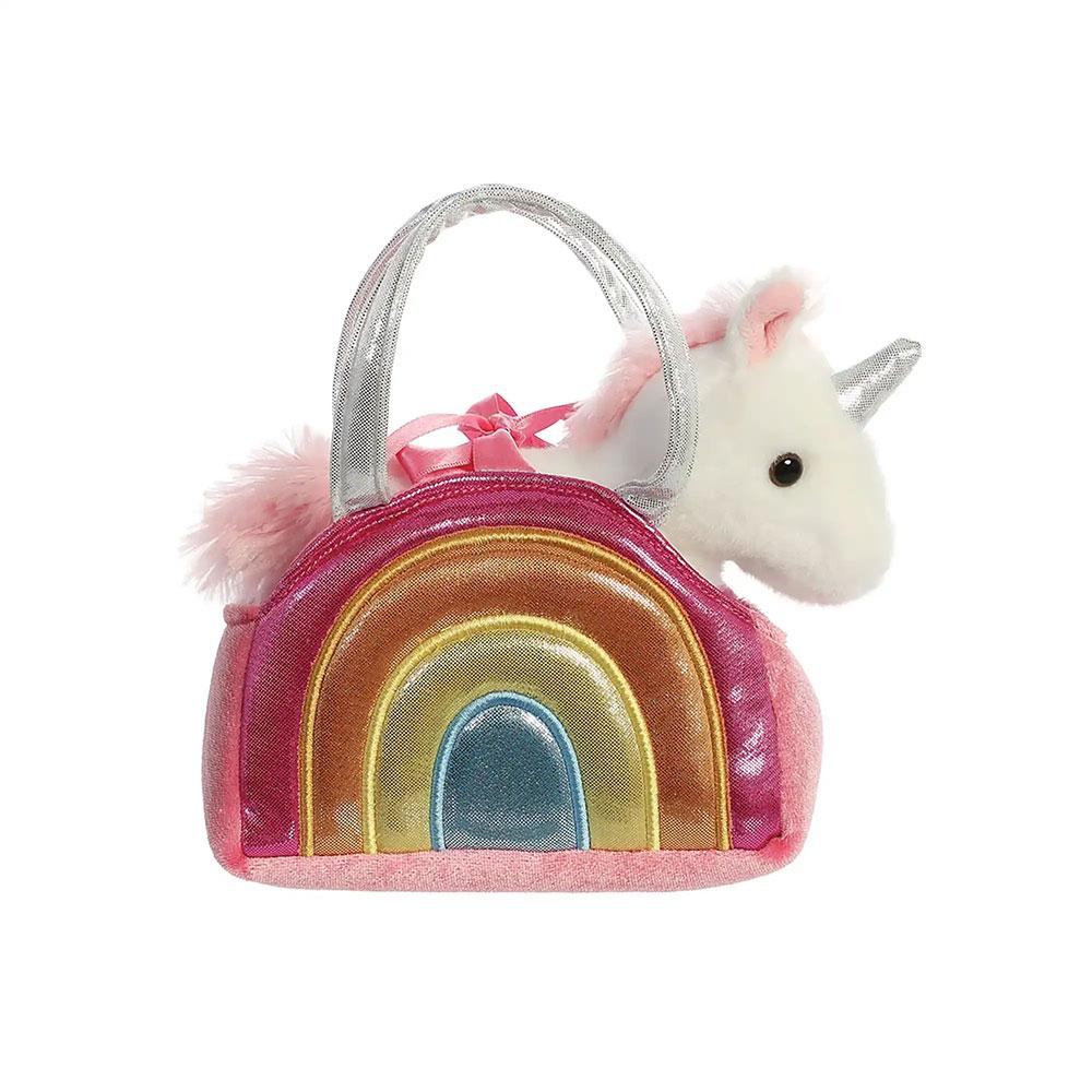 Fancy Pals Gökkuşağı Tek Boynuzlu At peluş oyuncağıyla tanışın! Bu sevimli tek boynuzlu at, ışıltılı taşıma çantasının içinde oturur. Tek boynuzlu atları seven herkes için mükemmel bir hediyedir! En güzel yanı, atın çantaya bağlı olmaması, böylece iki hediye bir arada sunulur – bir el çantası ve bir peluş oyuncak!