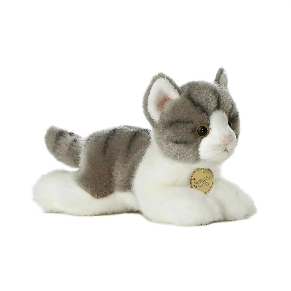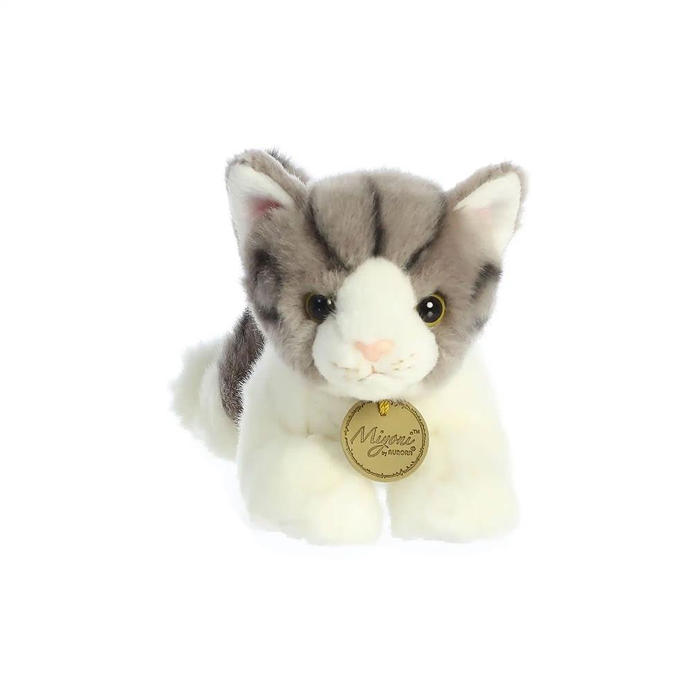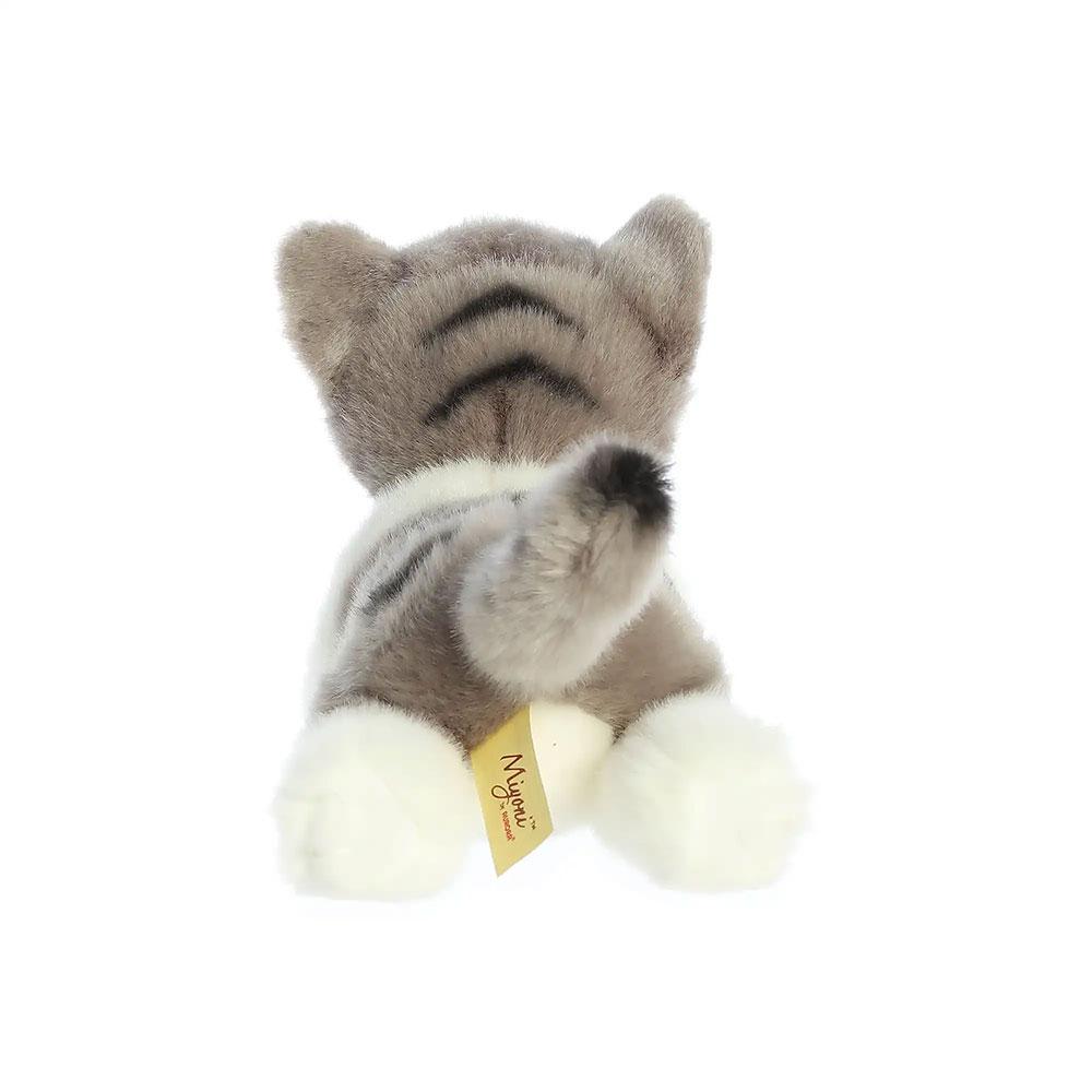 Miyoni serisi, en sevdiğiniz hayvanları gerçekçi ve sevimli tasarımıyla peluş formunda sunar! Bu gri Tekir Kedi, gri çizgileri ve beyaz alt kısmıyla dikkat çeker; karnının üzerinde yatarken ön ve arka bacaklarını uzatmış haldedir.